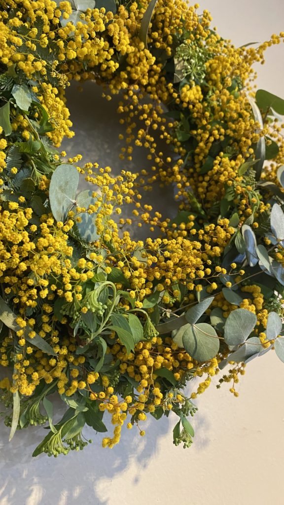 生徒さんからのプレゼント、ミモザとミントの生花のリースとともに。